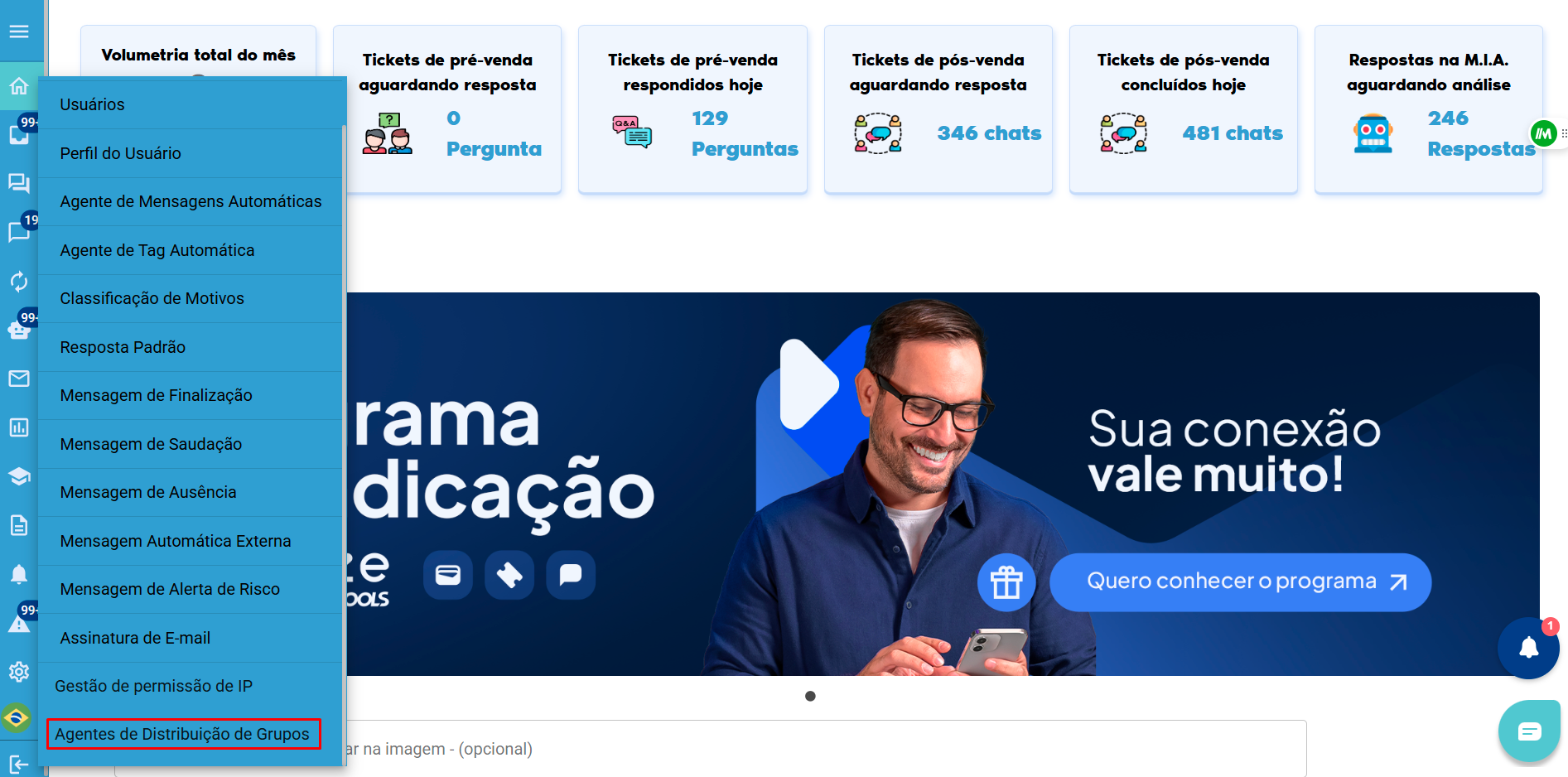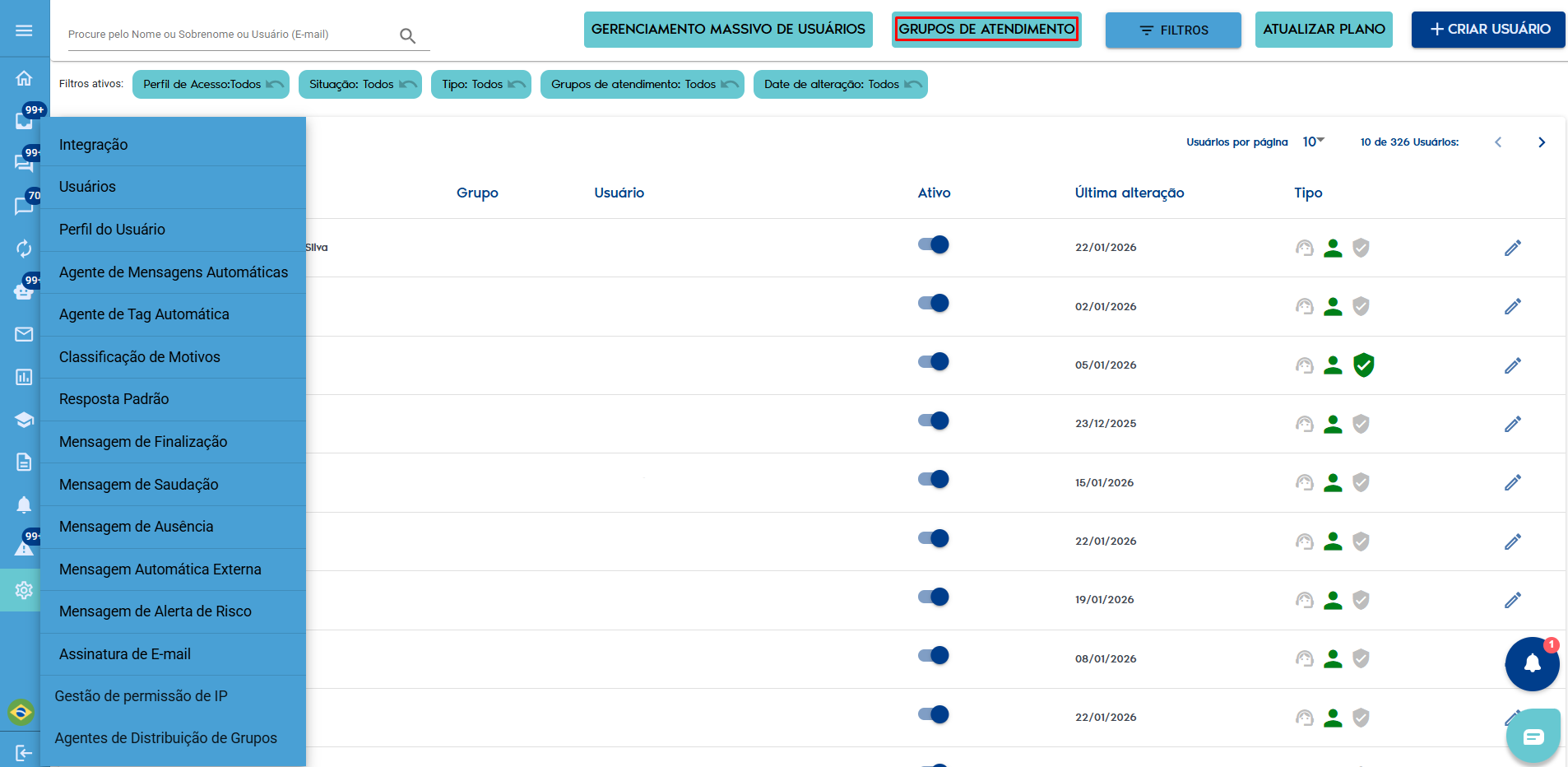 Menu Lateral> Usuários> Grupos de Atendimento