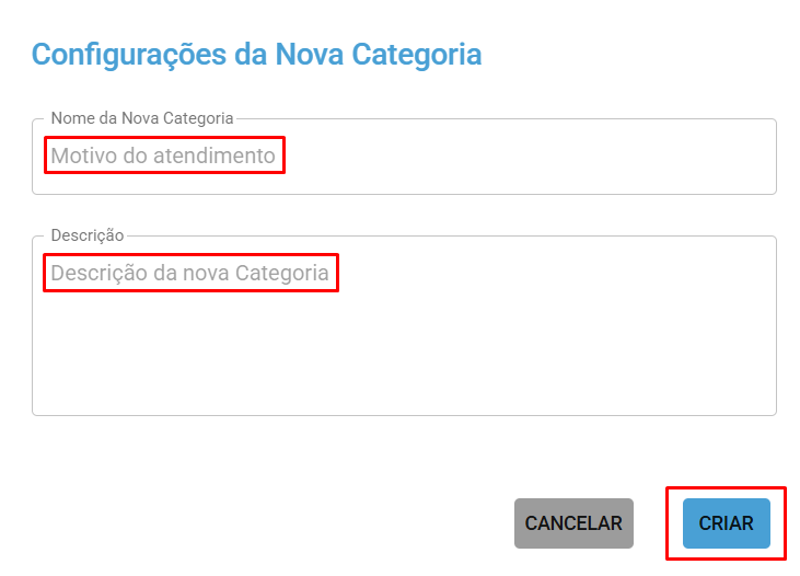 Botão Criar para adicionar um novo motivo principal (categoria)